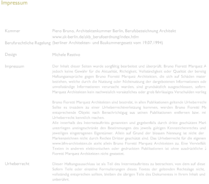 DAVID MEYER architektur und design (im Folgenden dMAD genannt) ist bestrebt, in allen Publikationen geltendes Urheberrecht zu beachten. Sollte es trotzdem zu einer Urheberrechtsverletzung kommen, wird dMAD die entsprechenden Grafiken, Tondokumente, Videosequenzen und Texte nach Benachrichtigung aus seiner Publikation entfernen, bzw. mit dem entsprechenden Urheberrecht kenntlich machen. Alle in diesem Internetauftritt verwendeten Fotos geniessen urheberrechtlichen Schutz. Die Bildrechte liegen bei dMAD oder den im Webangebot genannten Fotografen. Die Fotos dürfen nicht ohne schriftliche Genehmigung durch dMAD oder den jeweiligen Fotografen vervielfältigt oder veröffentlicht werden. Alle innerhalb des Internetauftrittes genannten und ggfs. durch Dritte geschützten Marken- und Warenzeichen unterliegen uneingeschränkt den Bestimmungen des jeweils gültigen Kennzeichenrechts und den Besitzrechten der jeweilig eingetragenen Eigentümer. Alleine aufgrund der bloßen Nennung ist nicht der Schluß zu ziehen, dass Markenzeichen nicht durch Rechte Dritter geschützt sind. Eine Vervielfältigung von Grafiken, Bildern und Texten in anderen elektronischen oder gedruckten Publikationen oder für anderweitige gewerbliche Zwecke ist ohne ausdrückliche, schriftliche Zustimmung von dMAD bzw. der Urheberrechtsinhaber nicht gestattet.