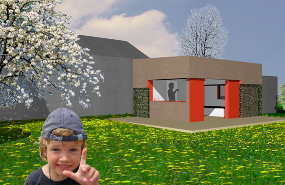 Die Laube wird so auf dem Grundstück positioniert, dass möglichst viel Freifläche verbleibt. Räumlich lehnt die Laube sich an die Nachbarbebauung an, die unterschiedlichen Fensterformate orientieren sich in ihren Ausrichtungen auf mögliche Durchblicke zwischen den Bestandsbauten.