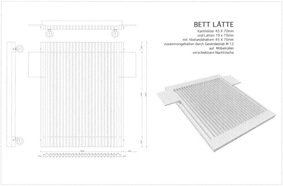 Das Bett besteht aus einem Lattenrost auf Rollen, der nur durch den Druck zweier Gewindestangen zusammengehalten ist. Die Nachttische werden lediglich mit einem Kantholz in Stärke der Abstandhalter eingehängt, und sind frei verschiebbar.