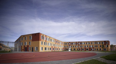 Eine zentrale Halle bildet das Rückgrat des Frauenhafthauses und verbindet Verwaltung, Werkstätten, Gewächshaus, Sporthalle mit dem Zellentrakt, der sich aus organisatorischen Gründen zick-zackförmig um die Innenhöfe zieht.