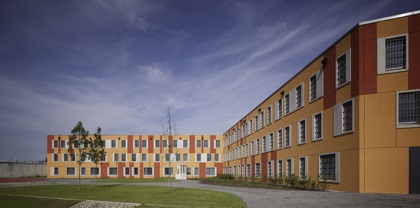Die gestaffelte Kubatur, die unregelmäßig angeordneten Fensterelemente und die frei verteilten Farbfelder belegen den gewaltigen Gebäudekomplex mit kleinteiligen, dynamischen Strukturen.